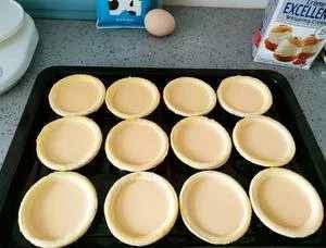 8、把蛋撻皮擺在烤盤裡,把蛋撻液倒入蛋撻皮(7-8分滿)