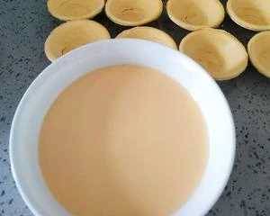 牛奶 110克 、細砂糖 40克 、雞蛋 2個 、淡奶油 80克 、速凍蛋撻皮 14個