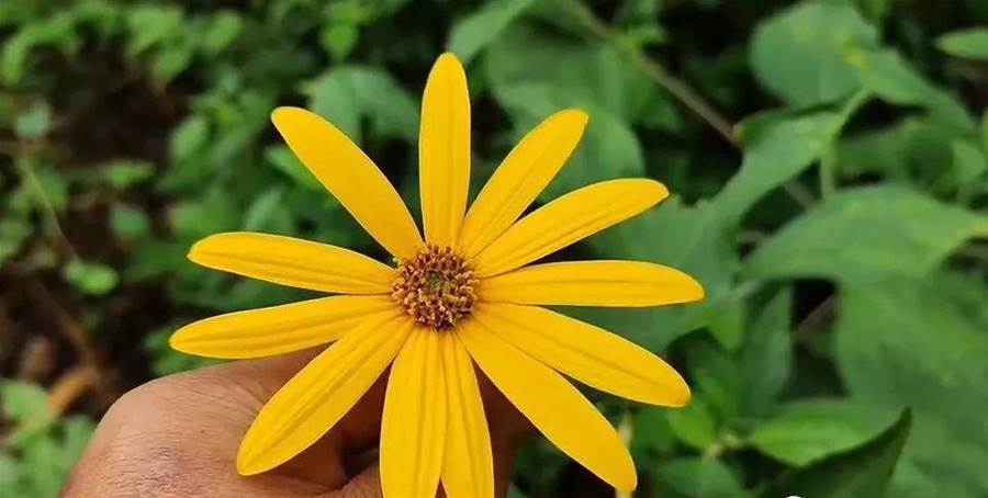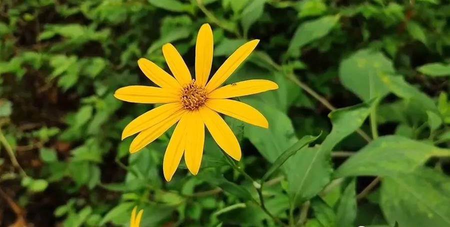 它的葉子是橢圓尖形的,寬度5-6厘米,長度10-13厘米左右,葉子邊緣有非常細小的鋸齒,背面和表面都有一層白色小絨毛。 它的花期是9-11月份,在枝干的頂端,就會開出這種黃色的花,看著還是非常漂亮的。花瓣是長條形的,寬度不到1厘米,長度2-3厘米左右,整個花瓣伸向四面八方,中間有細小的黃色的花蕊,看起來就像一個小小的太陽。