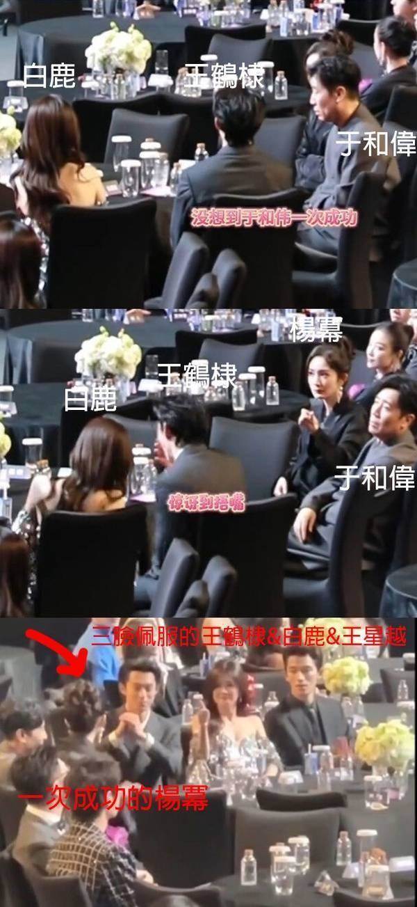 《以愛為營》CP也同框啦! 白鹿和王鶴棣雖然沒有一起走紅毯,但在頒獎禮台下坐在一起,同桌的還有楊冪、于和偉和《寧安如夢》白鹿的男二王星越。 這一桌王鶴棣、楊冪和白鹿幾乎都是社交悍匪,有他們在完全不用怕冷場,幾人還被大家發現竟然在台下玩扔瓶子游戲~