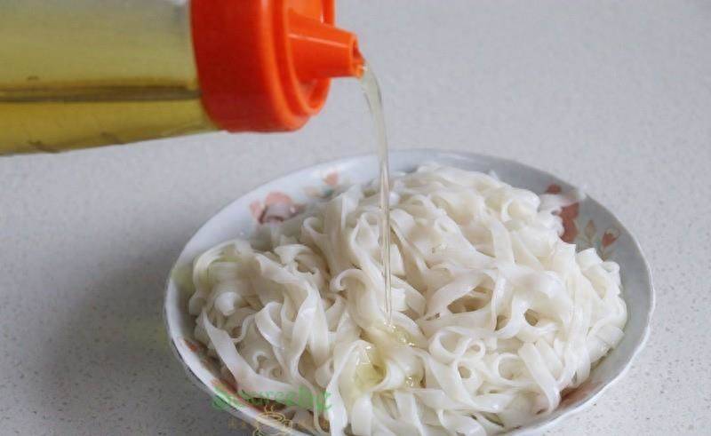 步驟3:煮熟的河粉撈出,快速過冷水,讓溫度減低,接著用一個盤子裝好,倒入適量的花生油攪拌均勻。很多人少了這一步,就會粘鍋,斷裂。