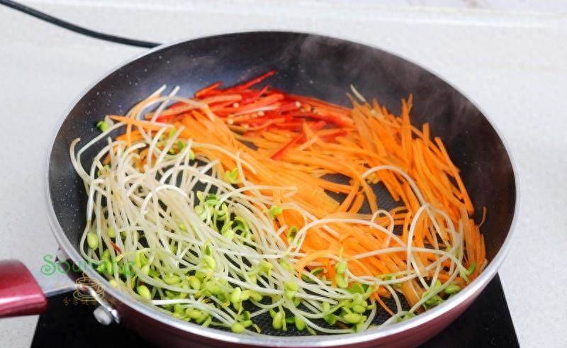 步驟5:接著倒入豆芽、胡蘿卜絲、辣椒等食材爆炒,要快速翻炒。其中不吃辣椒的可以不翻辣椒,個人覺得加點辣椒,不僅顏色好看,味道更好吃。