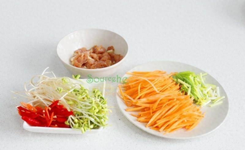 步驟1:食材的準備工作,豬瘦肉洗凈切薄片,放鹽、花生油、生粉、料酒、生姜、醬油攪拌均勻。豆芽去根部,清洗干凈撈出瀝干水,胡蘿卜去皮清洗干凈,切胡蘿卜絲。辣椒、香蔥也分別洗凈切好備用。