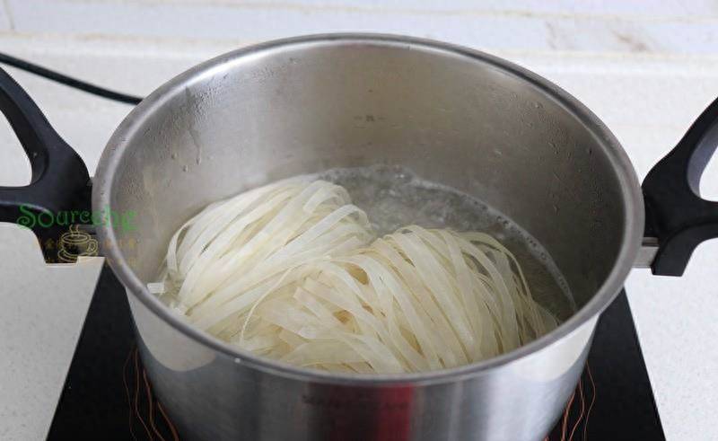 步驟2:煮鍋倒入適量的水,煮沸之后,放河粉,煮2至3分鐘,煮河粉的時候,要用筷子攪拌,防止粘鍋。