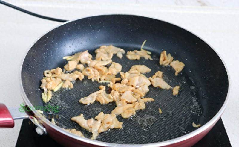 步驟4:鍋燒熱之后,轉為旺火,倒入豬瘦肉爆炒,顏色變了之后,就可以快速盛出。如果是用牛肉炒河粉,也是相同的方法。