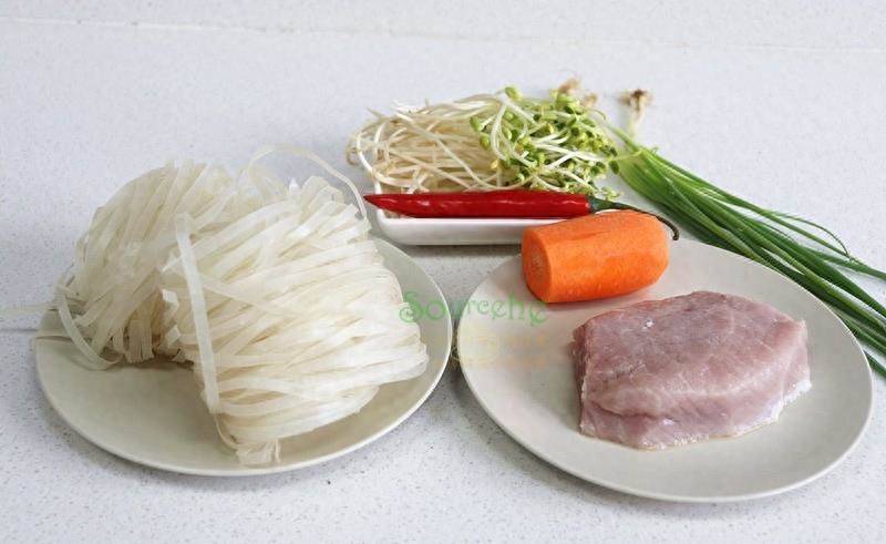 食材(2人食量):干河粉2個、豬瘦肉適量、胡蘿卜半個、豆芽、香蔥、紅辣椒1個、花生油、食用鹽、醬油、蠔油、香蔥、生粉、料酒、生姜。
