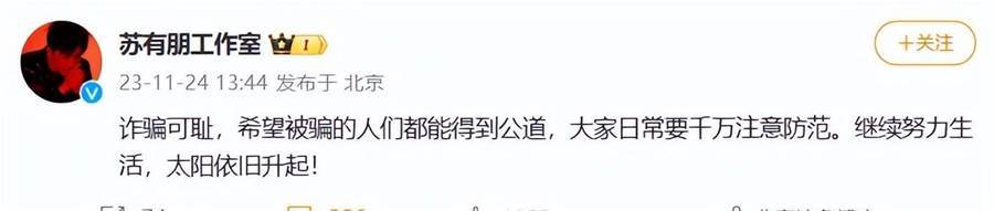 對此蘇有朋工作室第一時間發文:「詐騙可恥,希望被騙的人們都能得到公道!」
