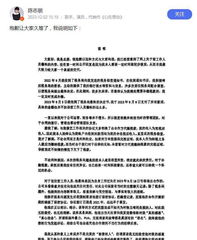 12月初,已出道35年的老牌藝人陳志朋,忽然被前員工曝出疑似偷稅高達1000萬之多,并發送長文控訴他的「多宗罪」,一時間引起熱議。