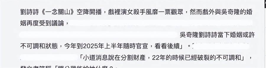 但是如今,劉詩詩新劇《一念關山》剛剛開播,熱度極大,台媒再度曝出他與丈夫關系緊張,并稱「兩人的婚姻已不可調和了」。