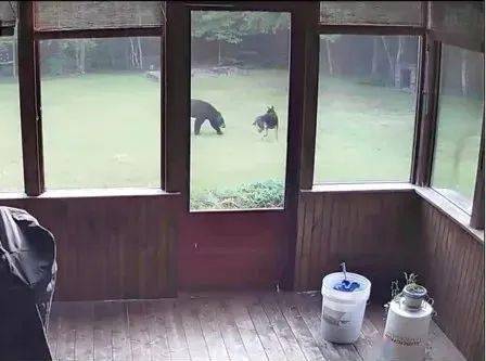 美國佛蒙特州,鄰居突然上門,告知鏟屎官Jenn:剛剛你家的狗子,和一頭小熊在玩耍!
