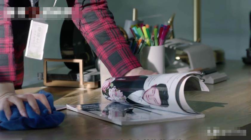還有就是劇中的這個片段,鏡頭里身為柏海公司里的花藝實習生凌凌七,正在一臉抱怨的收拾柏海的辦公室,而就在她擦拭桌面時,突然看到了雜志上的柏海的照片。