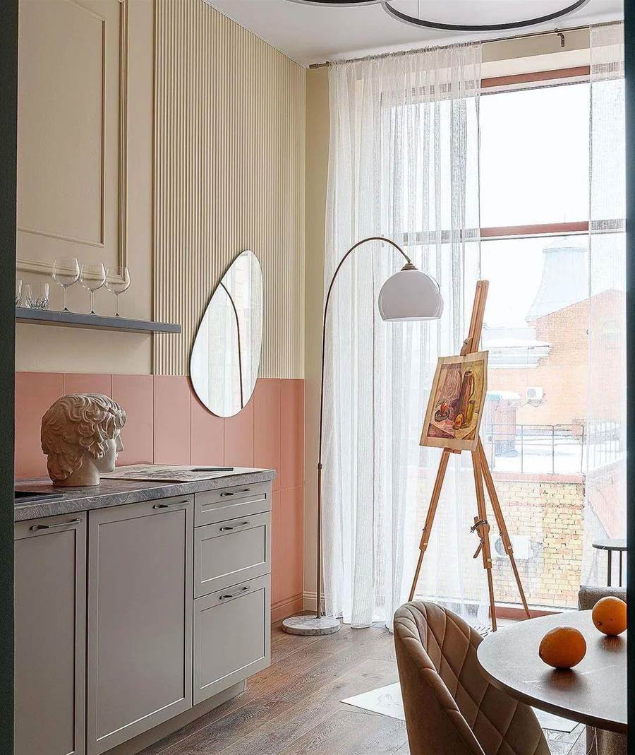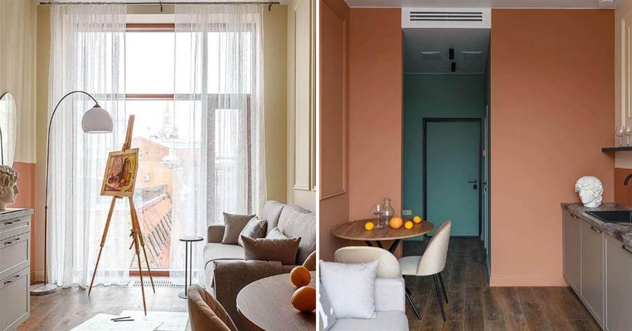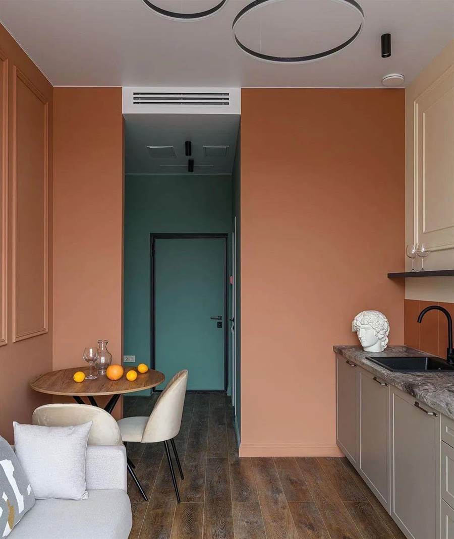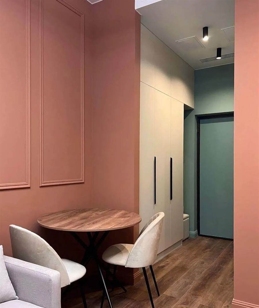 設計師選擇了簡約風格的淺色傢俱,地板是深色強化木地板。墻壁被漆成桃色,同時有一個相當漂亮的米色過渡。廚房很小,缺少上層櫥柜,這大大減少了存儲系統。盡管如此,還是有一個完整的水槽、一個內置迷你冰箱和一個兩個燃燒器的爐灶。