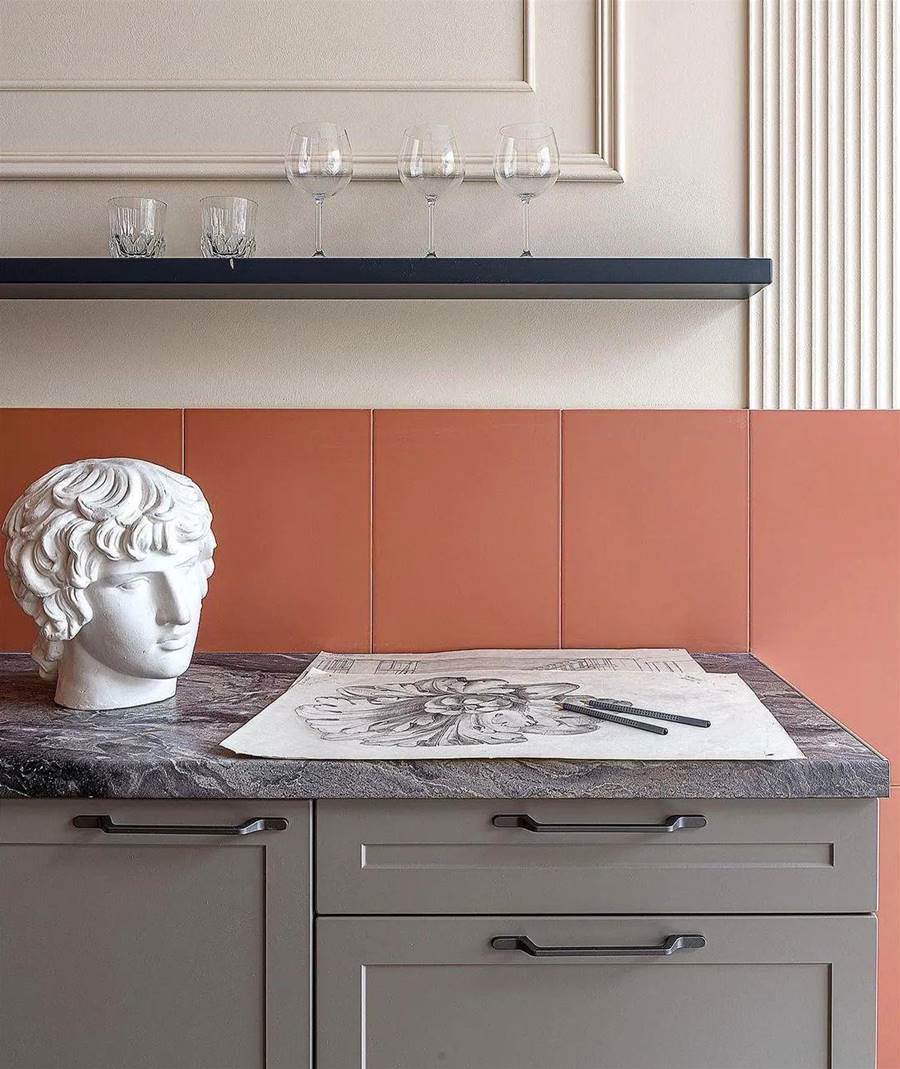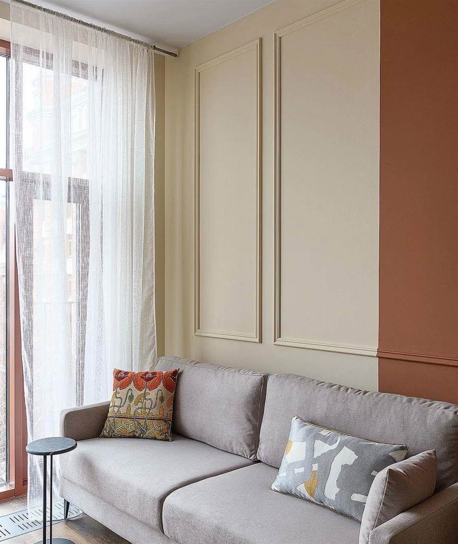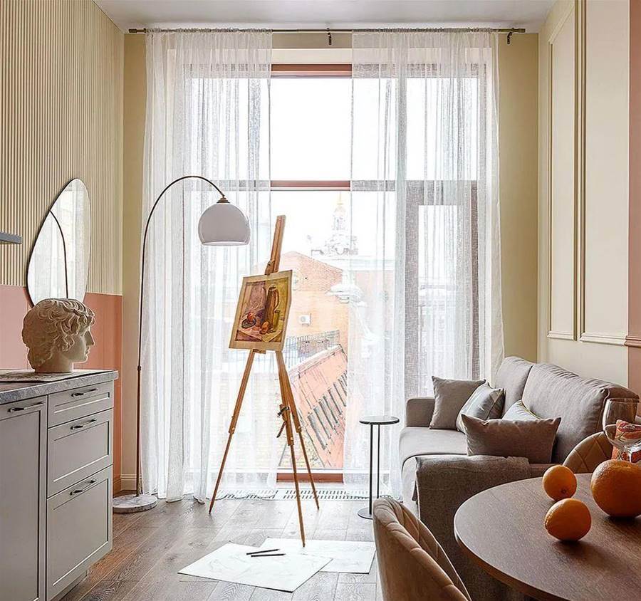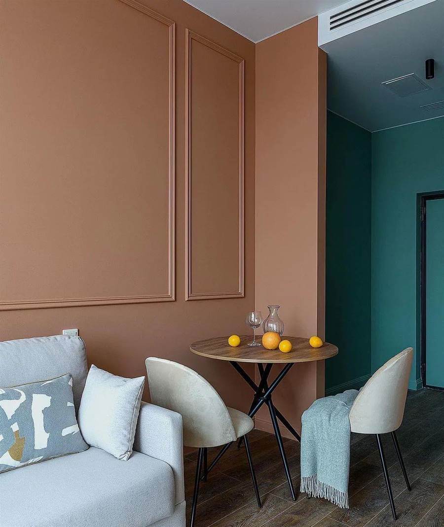 設計師選擇了簡約風格的淺色傢俱,地板是深色強化木地板。墻壁被漆成桃色,同時有一個相當漂亮的米色過渡。廚房很小,缺少上層櫥柜,這大大減少了存儲系統。盡管如此,還是有一個完整的水槽、一個內置迷你冰箱和一個兩個燃燒器的爐灶。