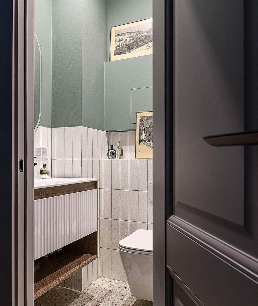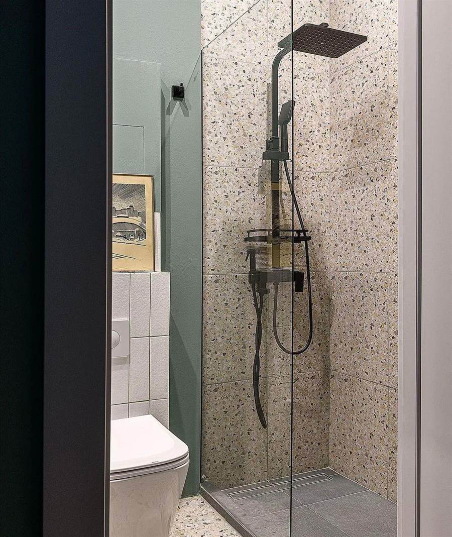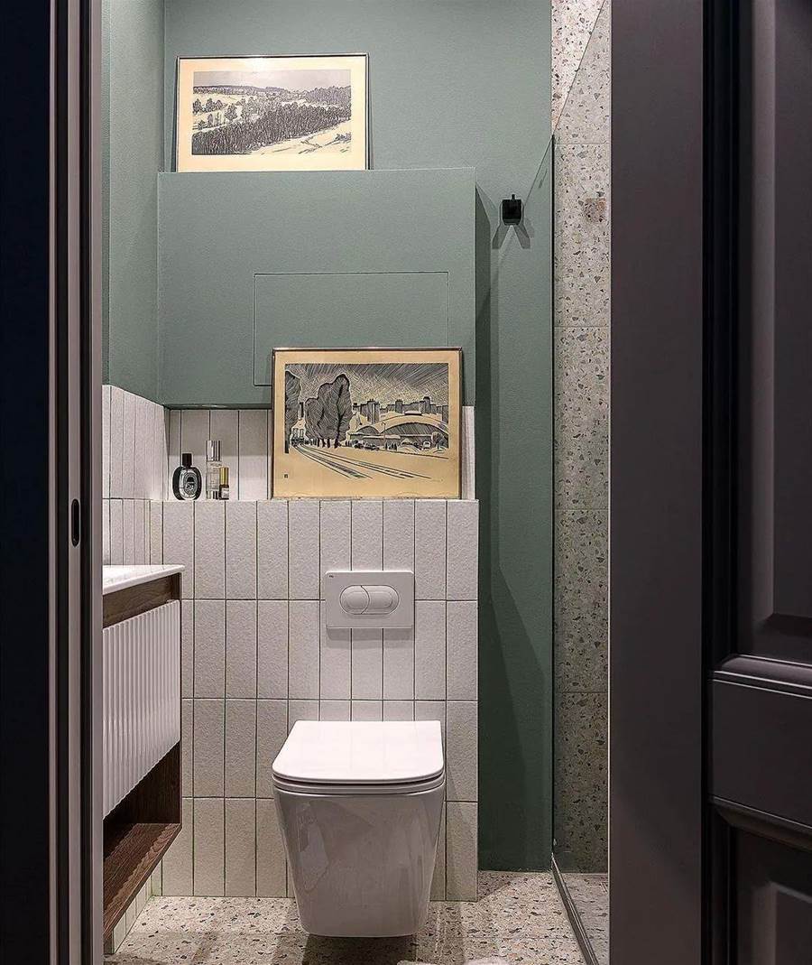 浴室很小,但時尚且實用。入口對面有一個帶安裝的壁掛式馬桶,左邊有一個深色木柜和一個內置水槽。