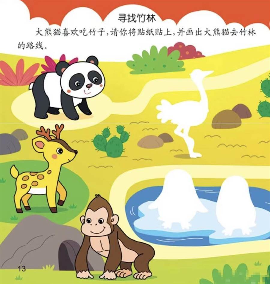 小孩子需要找到對應的貼畫,貼到上面,比如尋找竹林,需要孩子開動腦筋去思考,可以鍛煉孩子的思維能力。