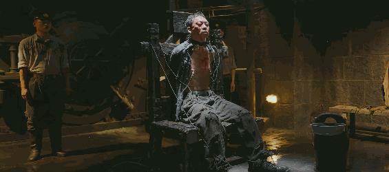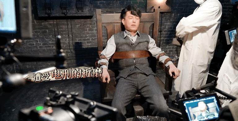 比如靳東,同樣是被電擊,被松松垮垮地綁住,他穿得板板正正滿臉橫肉都在晃悠。