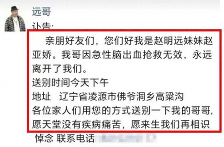2023年10月15日,趙明遠的妹妹趙亞嬌登錄趙明遠的社交賬號,在他的朋友圈發布訃告。從趙亞嬌的描述里,我們才知道趙明遠是因為急性腦出血搶救無效才去世。