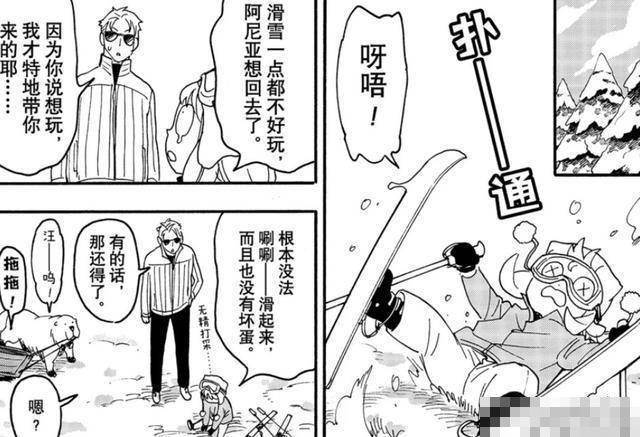 因為看動畫片的影響,阿尼婭心血來潮想要滑雪,本來黃昏是拒絕的,但是阿尼婭賣萌哭哭,黃昏果斷帶著一家子去滑雪了,這是真的寵閨女啊。