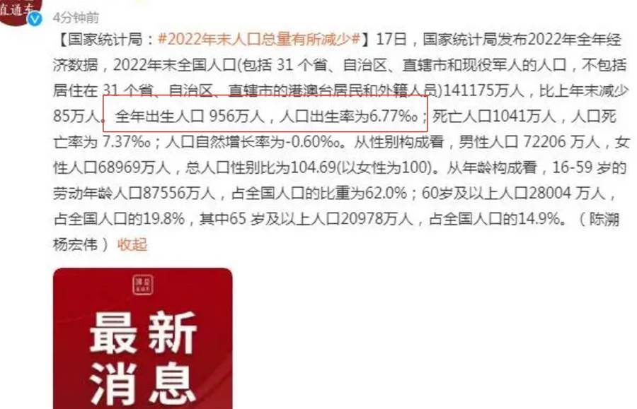 2022年我國出生人口956萬人,比2021年減少了106萬人,出生人口率為6.77‰!也就是說,在一年之中1000個人里面只有不到7個孩子出生。
