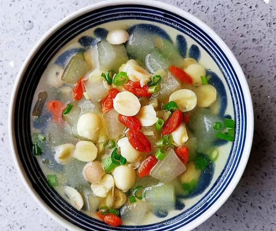 干蓮子放進碗中,浸泡一個晚上,泡發后洗凈。若有新鮮蓮子更好,洗凈即可。冬瓜去皮去內瓤,切成小塊。枸杞清洗干凈。香蔥洗凈,切成蔥花。