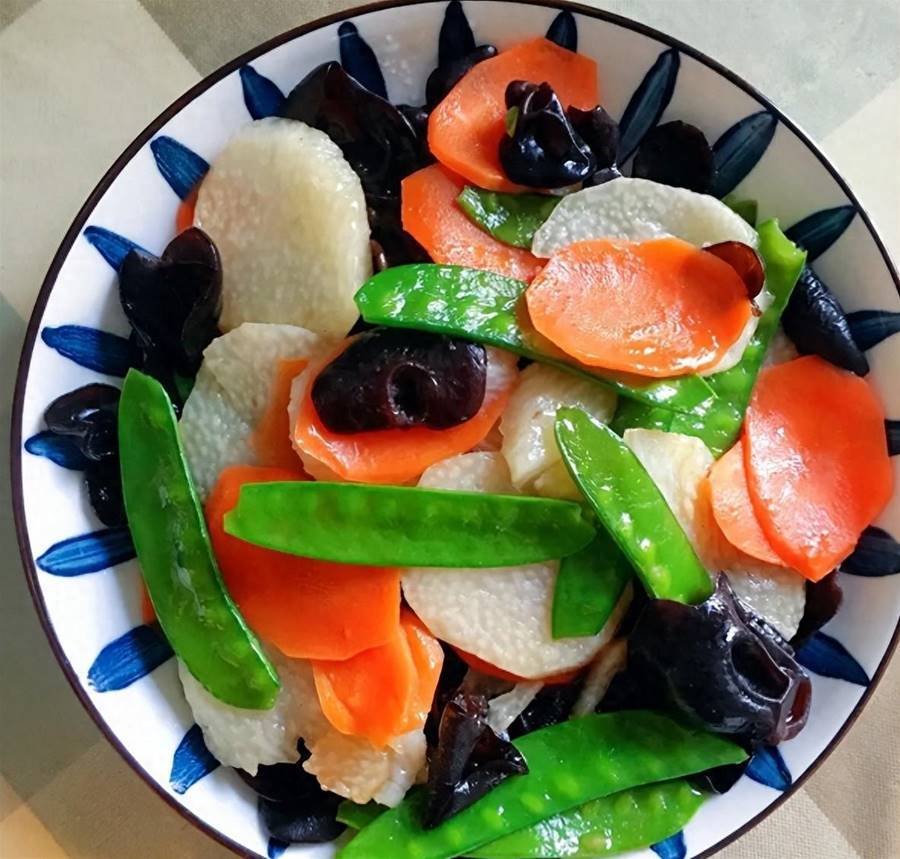 然后將木耳放進鍋內,煮兩分鐘,再倒入荷蘭豆、胡蘿卜片,繼續煮一分鐘撈出,瀝干水分。