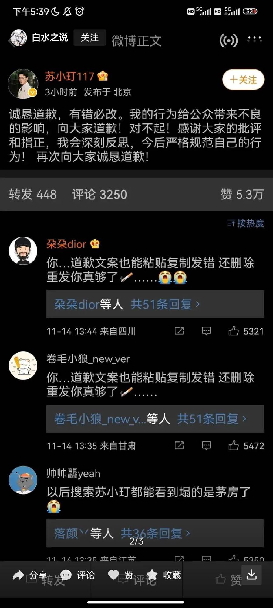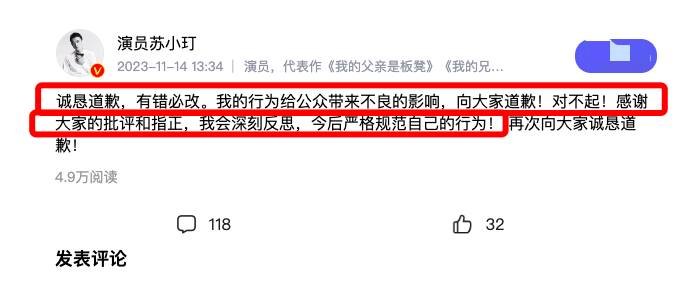 但眼尖的網友發現,他的道歉發布的文案跟之前塌房藝人道歉的話術非常的相似,所以就有一些網友懷疑他是不是粘貼復制的?