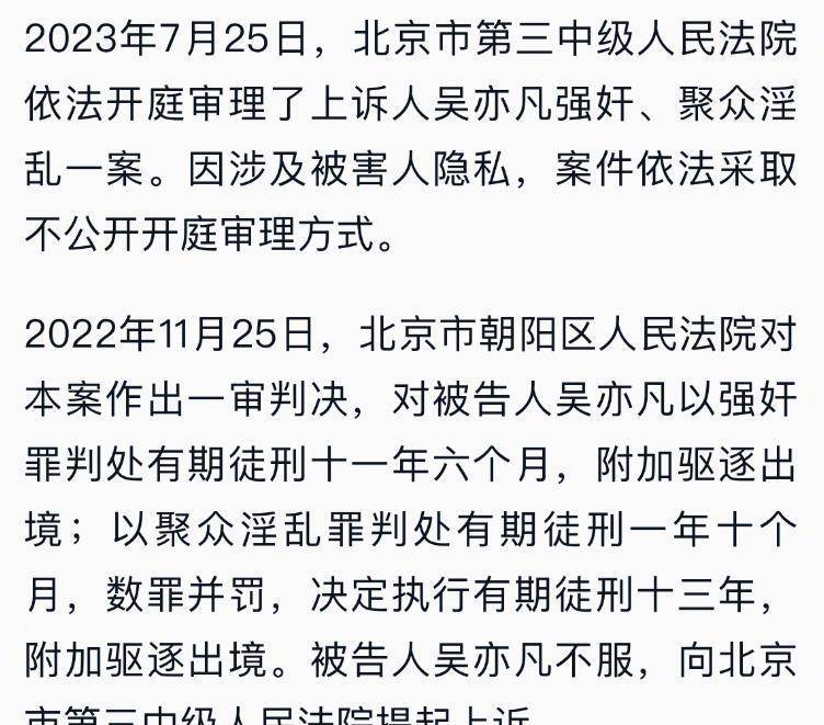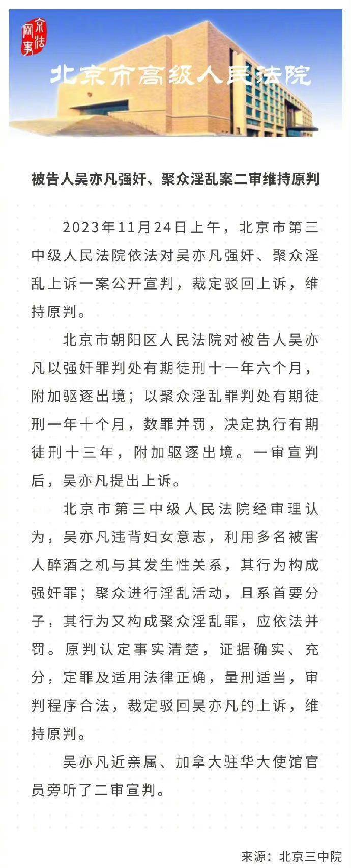 11月24日,北京市朝陽區法院公開宣判,被告人吳亦凡因強奸、聚眾[淫.亂]罪,被判處有期徒刑十一年六個月,數罪并罰,決定執行有期徒刑十三年,附加驅逐出境。這也是二審最終結果。