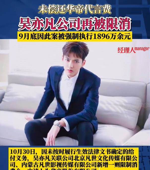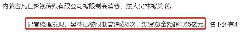 ——還可以用吳亦凡表哥吳林的情況做個參考啊,吳林負責吳亦凡經紀工作多年,參與多個公司運營,和吳亦凡深度捆綁,2022年12月,法院對吳亦凡表哥發布了限消令,涉及金額高達1.65億元。