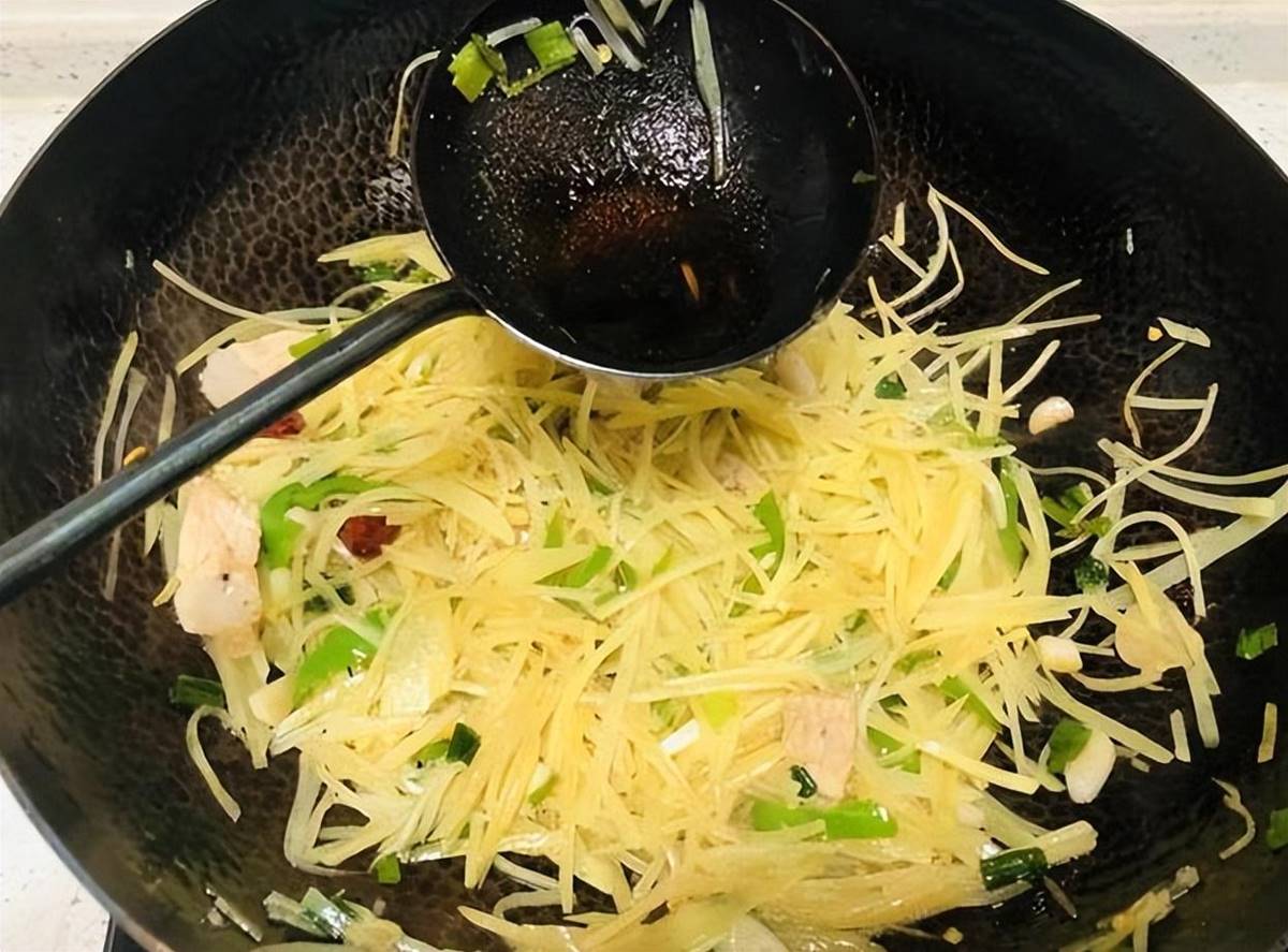 1. 熱鍋涼油: 鍋中加入適量油,燒熱后加入蔥姜蒜末爆香,然后放入土豆絲煸炒至變色。