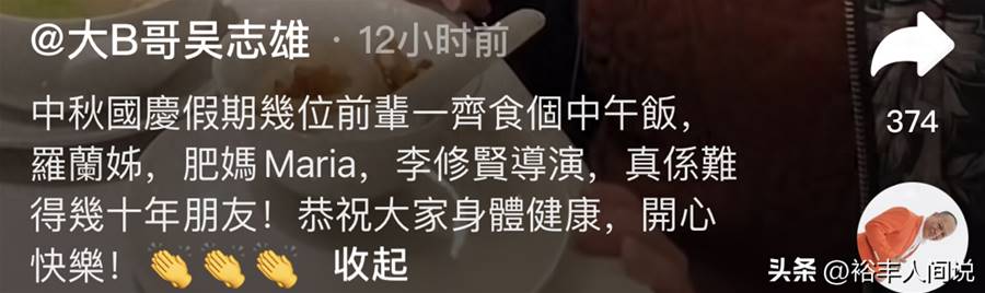 10月3號晚,「大B哥」吳志雄于視訊賬號上分享了一段聚餐的畫面,并在留言處一一介紹當天的好友,除了廣為人知的羅蘭之外,還有老牌港星李修賢,以及愛國港星肥媽。