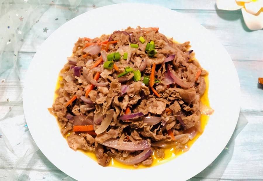 另起鍋加油,燒熱后放入胡蘿卜絲、洋蔥絲翻炒,至斷生,再倒入羊肉快炒幾下。