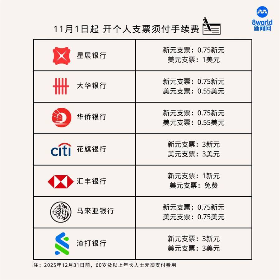 11月1日起,公众开个人新元支票手续费介于0.75新至3新不等。但在2025年12月31日之前,60岁及以上年长人士无须支付这笔费用。