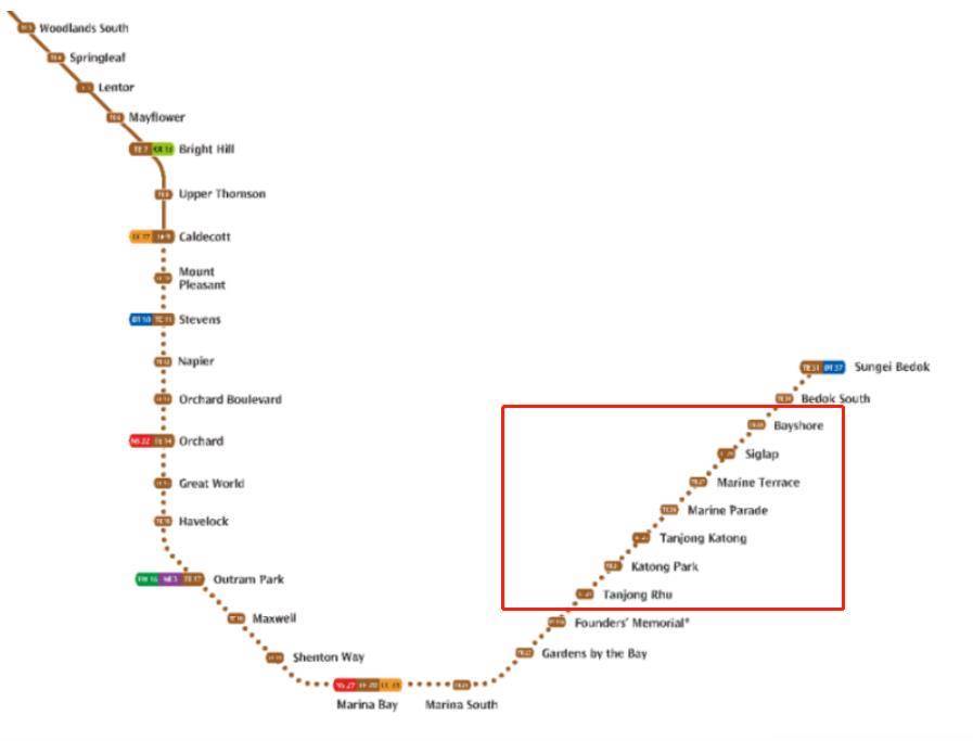届时将正式启用七个新地铁站:丹戎禺(Tanjong Rhu)、加东公园(Katong Park)、丹戎加东(Tanjong Katong)、马林百列(Marine Parade)、马林台(Marine Terrace)、实乞纳(Siglap)、碧湾(Bayshore)。
