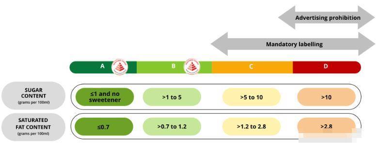根据Nutri-Grade规定,营养标签标注为A、B、C、D四个等级。其中,C级和D级将被强制贴标签,而D级更是被禁止广告宣传!