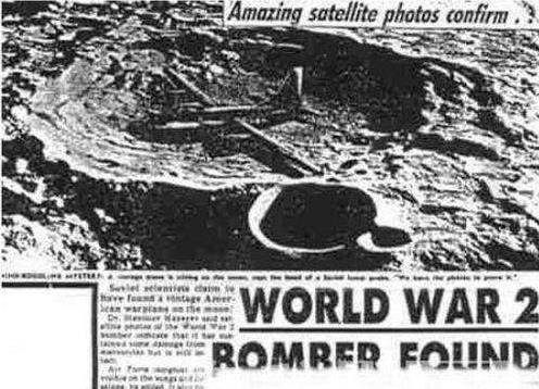這是30多年以前的事情了。據說這個消息最早出現在于英國的一個街頭小報上面。故事是這樣的,1987年3月蘇聯的繞月衛星在月球的背面發現了一件非常不可思議的事情。在月球背面的一個巨大隕石坑(環形山)居然發現了一架飛機。前蘇聯的專家經過分析這是一架美軍二戰時的戰斗機,型號可能是B-29轟炸機。