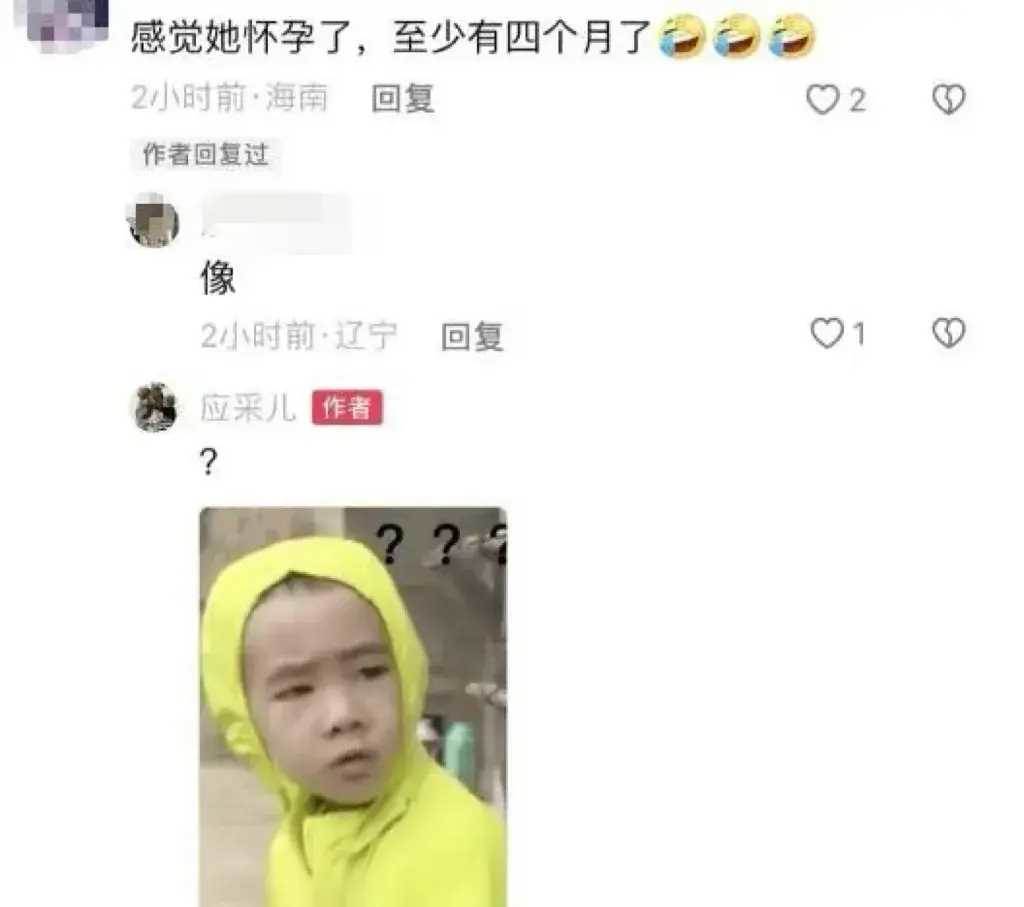 前陣子,應采兒還因為素顏加衣著寬松的造型被網友猜測是不是有三胎好消息。應采兒看到網友的評論回復了一個一臉疑問的表情包。可能真的是想多了。