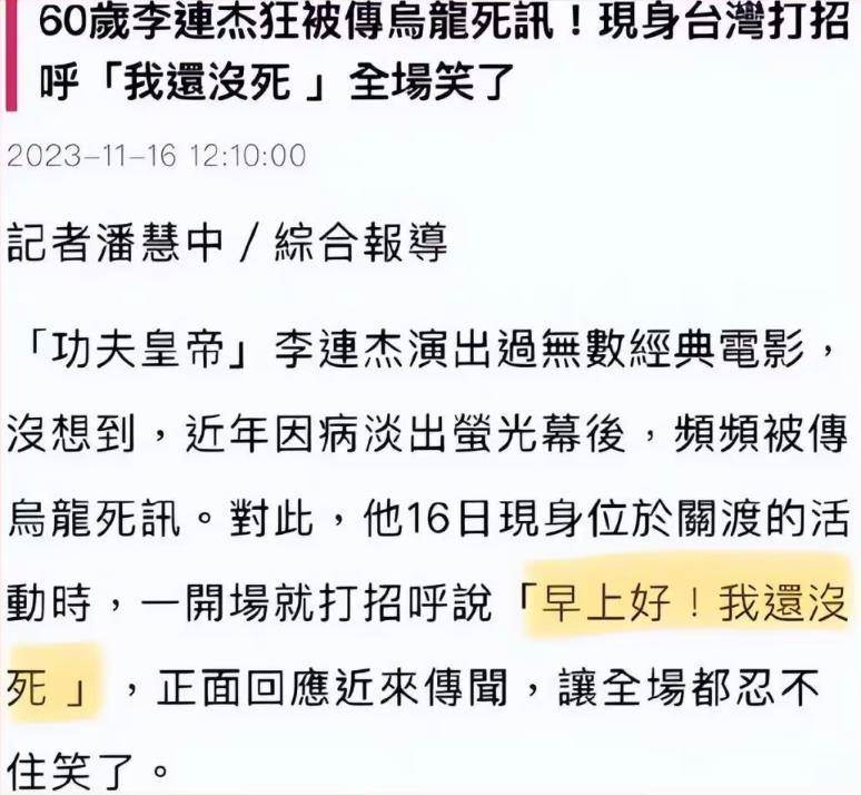 随后,李连杰公开回应:“早上好!我还没死!”通过这种幽默的方式,打破了外界子虚乌有的死亡传闻。