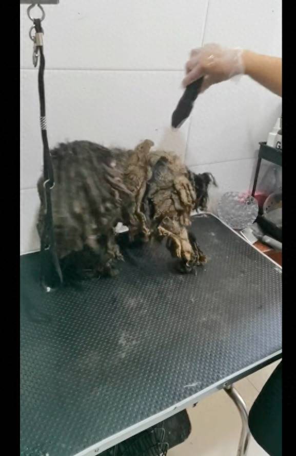 不過當再次回來的時候,狗狗已經站起來跑遠了,它的警惕性還挺高的,女士這下都沒法靠近它了。女士并沒有因此放棄,在和朋友合力幫助下,終于是將它給抓進了籠子里。隨即女士聯系了當地的一家寵物店,將狗狗給送了過去。寵物店的工作人員說,也從來沒有見過這樣的流浪狗,首先剃毛就是個大問題,不僅是毛發厚重的問題,它還有點怕人,幾次碰到它都差點誤咬到工作人員!