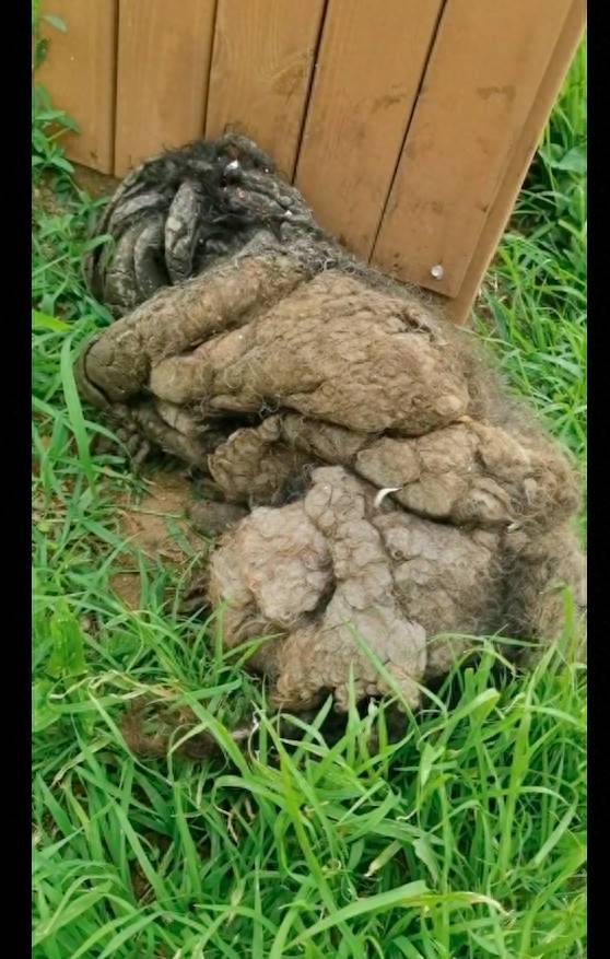 當時女士還以為那是一團毛線呢,等到靠近了才發現,這看起來像是一只狗狗呀!只不過狗狗的毛發實在是太長了,毛發上全部都是污垢打結了,像是一塊塊的泥土地一樣!也許是累了還是餓暈了,女士靠近后它也沒有覺察到,只能看到肚子微微的起伏,才證明它還活著。女士此刻的心也不平靜了,她無法就這樣放任狗狗繼續流浪,哪怕有一點的希望也要救它。于是女士就先將家狗給帶回了家,然后又拿來籠子叫來朋友一起打算抓它。