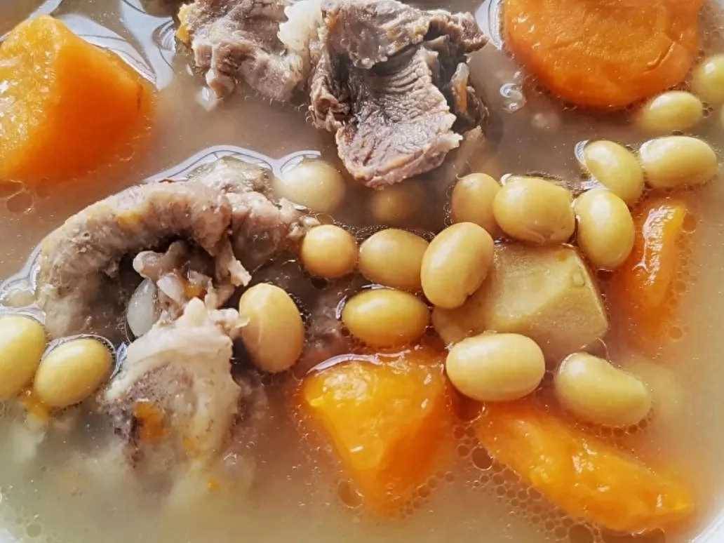 3、將筒骨、黃豆和姜片先放入湯鍋中,加入適量的清水,開大火煮開后轉小火先燉煮半個小時。接著再放入胡蘿卜燉煮半個小時。