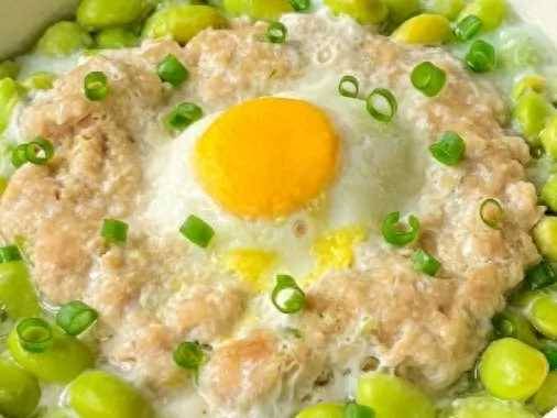 3、將毛豆和肉末都擺放在蒸碗中,在肉末的中間位置挖出一個洞,打入一個雞蛋,水開再上鍋蒸二十分鐘左右。