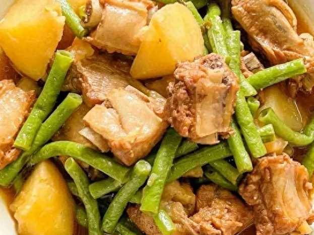4、水燒開后,轉小火燉煮半個小時。接著放入豆角和土豆,繼續燉煮二十分鐘左右。最后開大火翻炒收汁即可出鍋裝盤開吃。