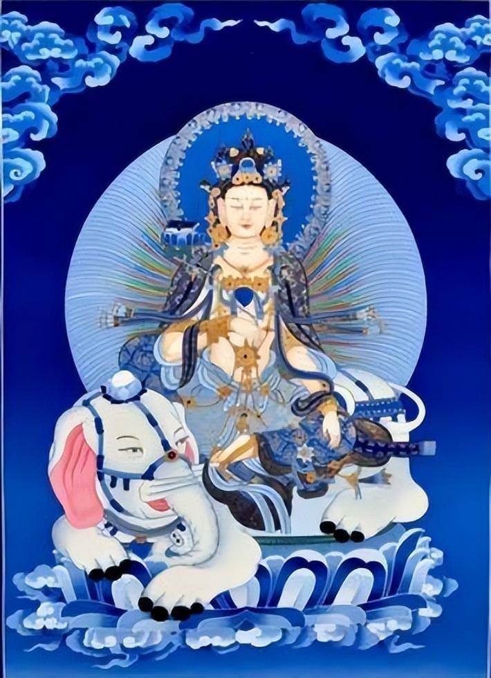 普賢菩薩,是大行的代表,是禮德和行願的象徵。他與文殊菩薩為釋迦牟尼佛的左、右脅侍,即文殊菩薩駕獅子侍釋迦牟尼佛左側,普賢菩薩乘白象侍釋迦牟尼佛右側,他們合稱為「釋家三尊」。文殊菩薩、普賢菩薩以及釋迦牟尼佛的法身佛毗盧遮那如來在一起時被稱為「華嚴三聖「,由此也可見普賢菩薩的地位在佛教中非同一般。