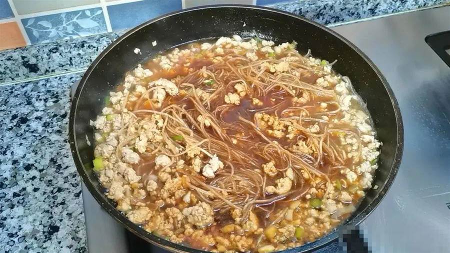 7,加清水,微微的淹沒肉沫,下入粉條,加鹽、生抽、老抽,拌勻,燉煮幾分鐘。
