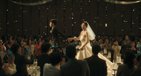 在交響樂聲中,新郎新娘手拉著手,緩步走向T台,台下的賓客起身注目,為他們鼓掌歡呼。