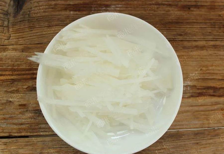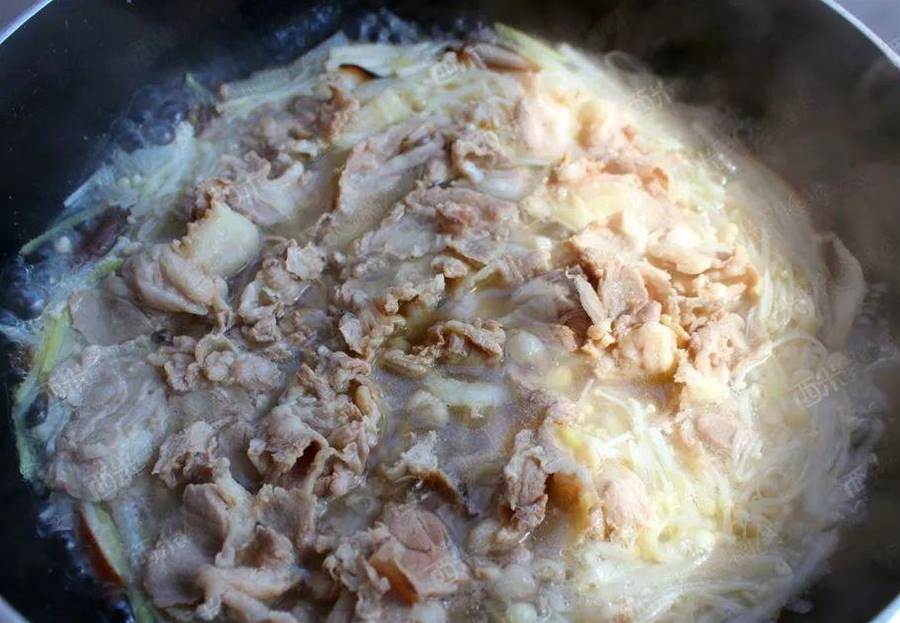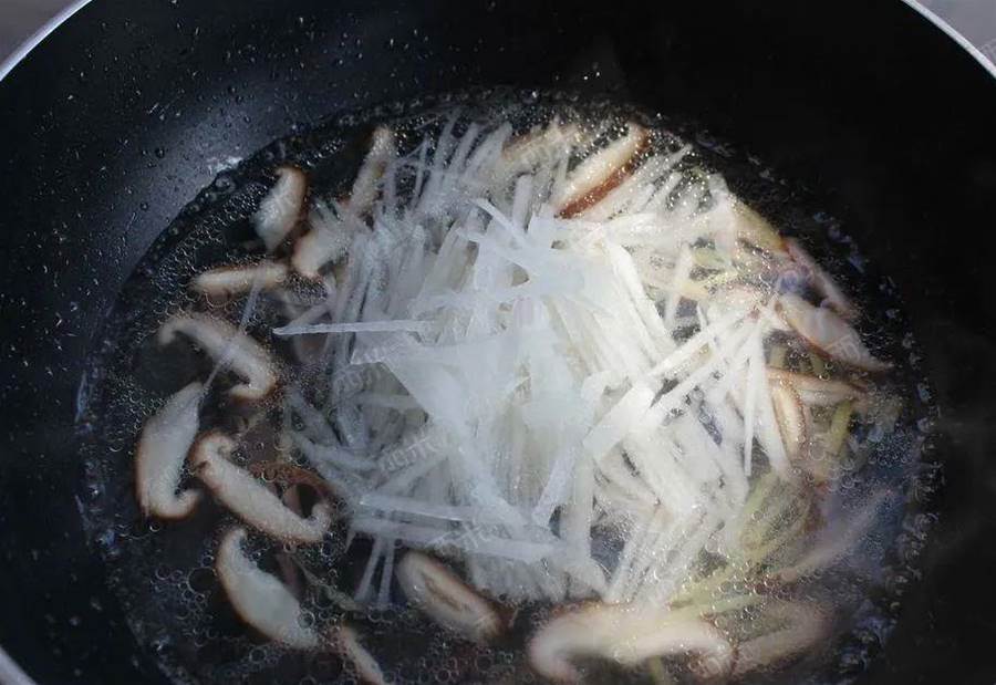 香菇出香味,倒入熱水,水開后下入蘿卜絲。金針菇。
