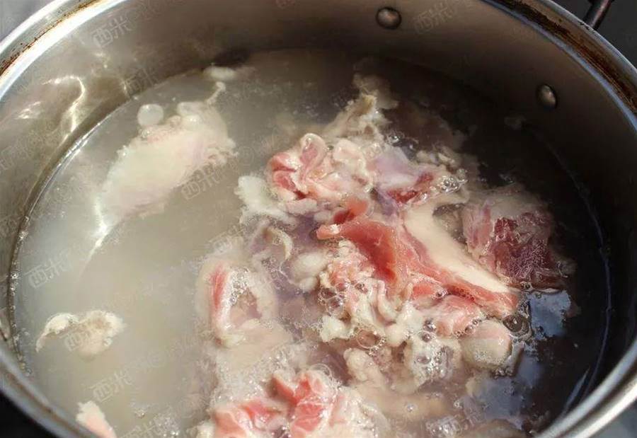 燒鍋熱水,下入羊肉片焯燙至變色馬上撈出。