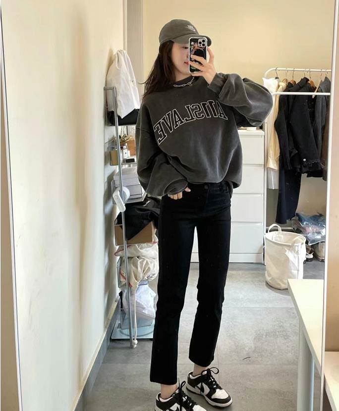美式復古風的穿搭,這一套看起來很酷啊,偶爾也要做一下酷酷的女孩,水洗炭灰色復古衛衣,下身搭配的是黑色九分直筒褲,運動鞋的加持,讓整個穿搭多了幾分休閑。