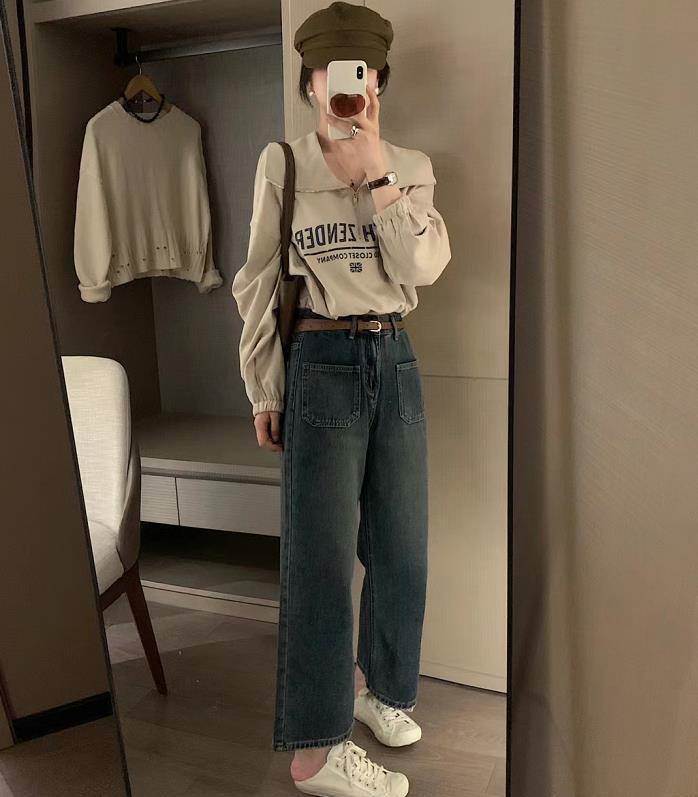 衛衣+牛仔闊腿褲,這兩組單品組合在一起,就是永不出錯的cp啊,奶茶色大翻領字母衛衣,搭配九分闊腿褲,經典百搭又休閑。
