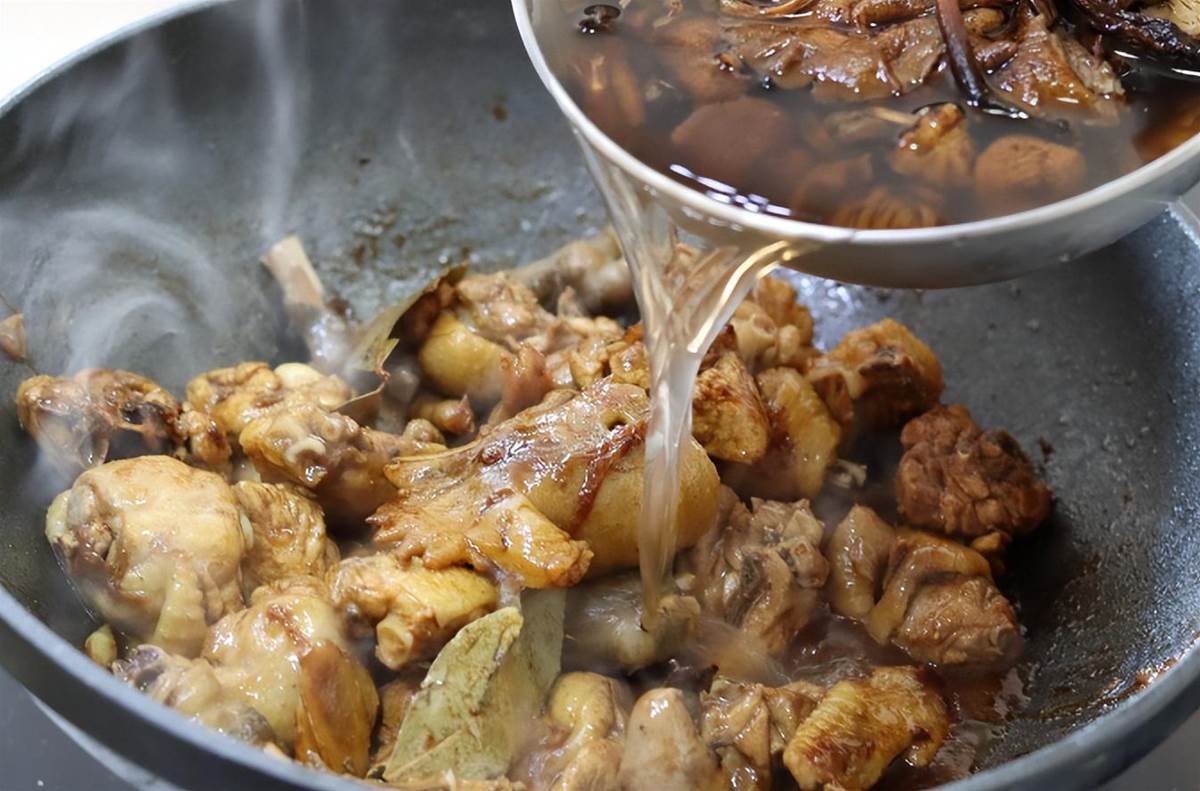 5. 加入調料:加入適量的老抽調色,適量的水沒過雞塊,蓋上鍋蓋燉煮。